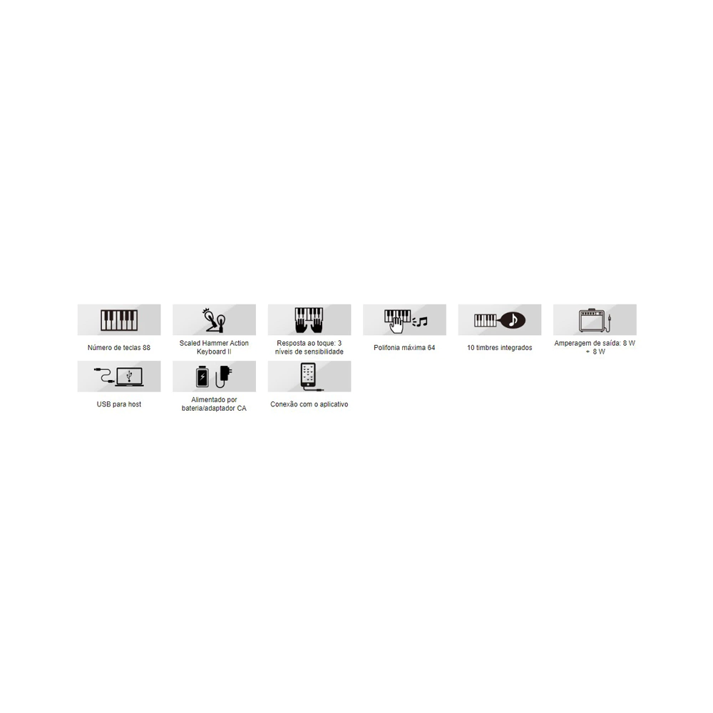 Número de teclas: 88 teclas sensitivas, com resposta ao toque